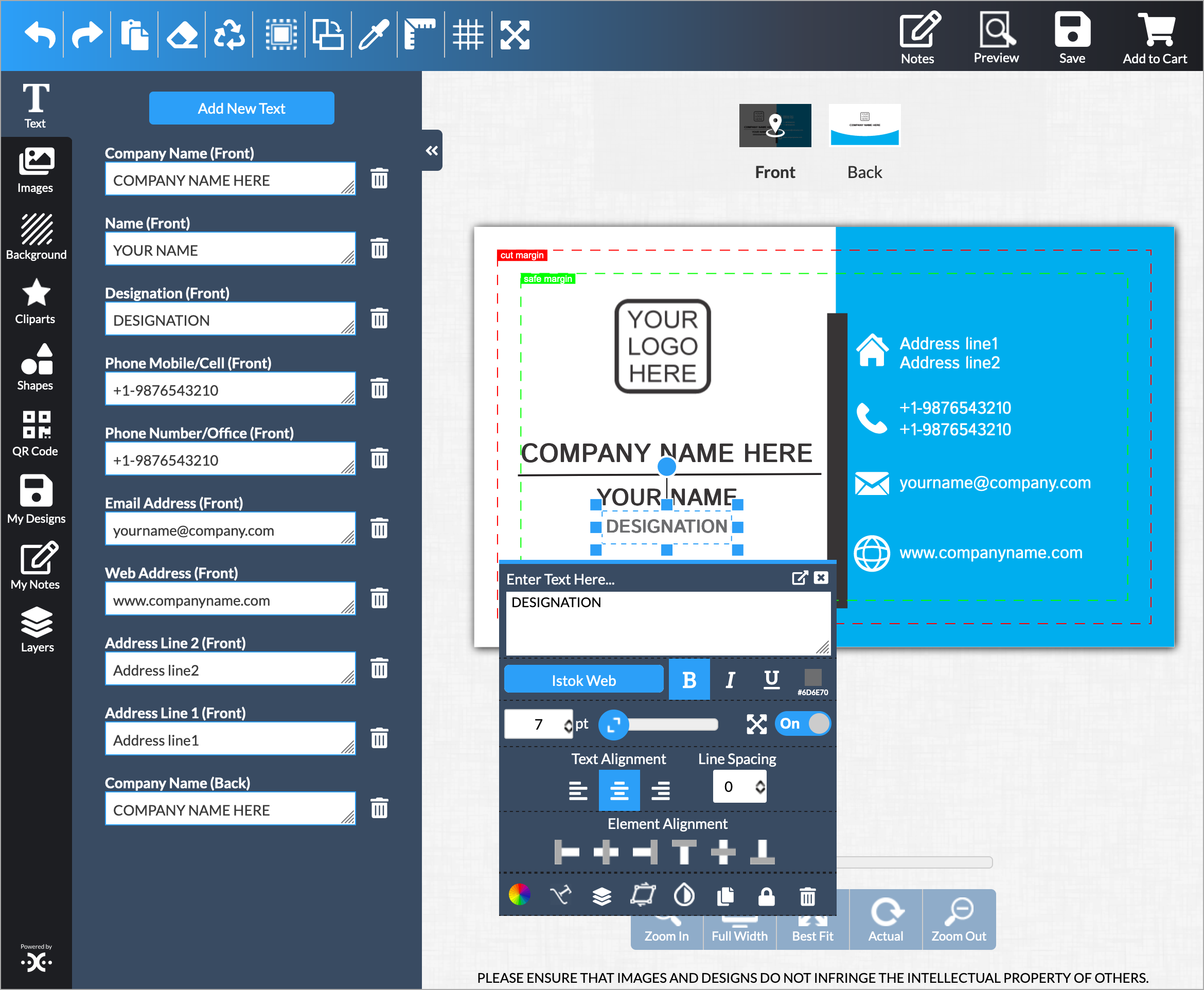 Not a lot of Online Design Tools out there have ability of Multi-line Text. With our nifty Text tool, customers can add Single Line or Multi-line Text easily in the Designs. The Text Box where customers enter their text has handy feature of Spelling Correction as well.